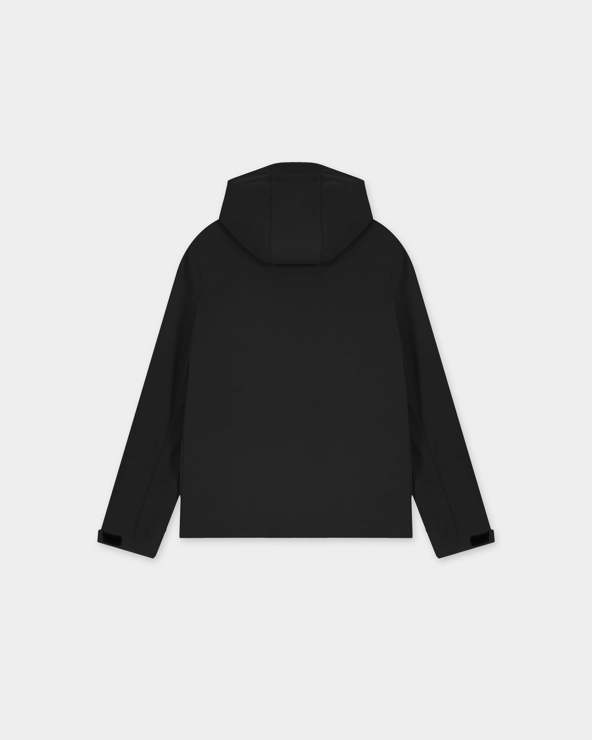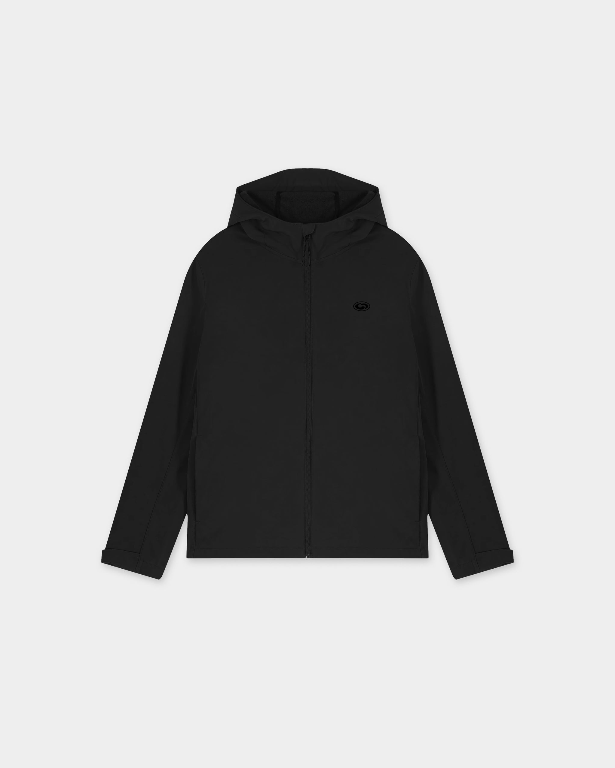 Classic fit waterproof course jacket. Made from bonded three-layer fabric with internal membrane. Fully bonded fleece inside layer. Side panels and stretch for better shape. Adjustable hook and loop sleeve opening. Hood opening and bottom hem with adjustable plastic stopper and elastic cord. Reverse nylon zip at centre front. Zipped welt pockets with reflective elastic puller. Featuring raised silicone print to the chest.